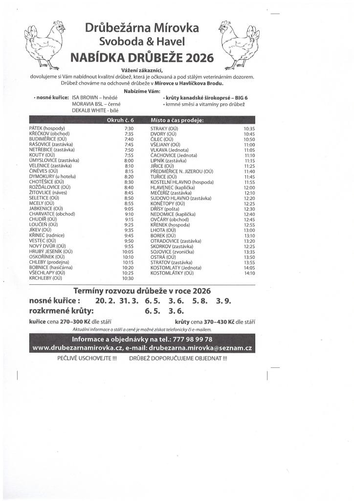 DRŮBEŽÁRNA MÍROVKA, Svoboda-Havel, prodává v pátek 20. února 2026 v 11:10 hod. u Jednoty nosné kuřice (hnědé, černé a bílé) - stáří 19-20 týdnů, cena 300 Kč/ks.